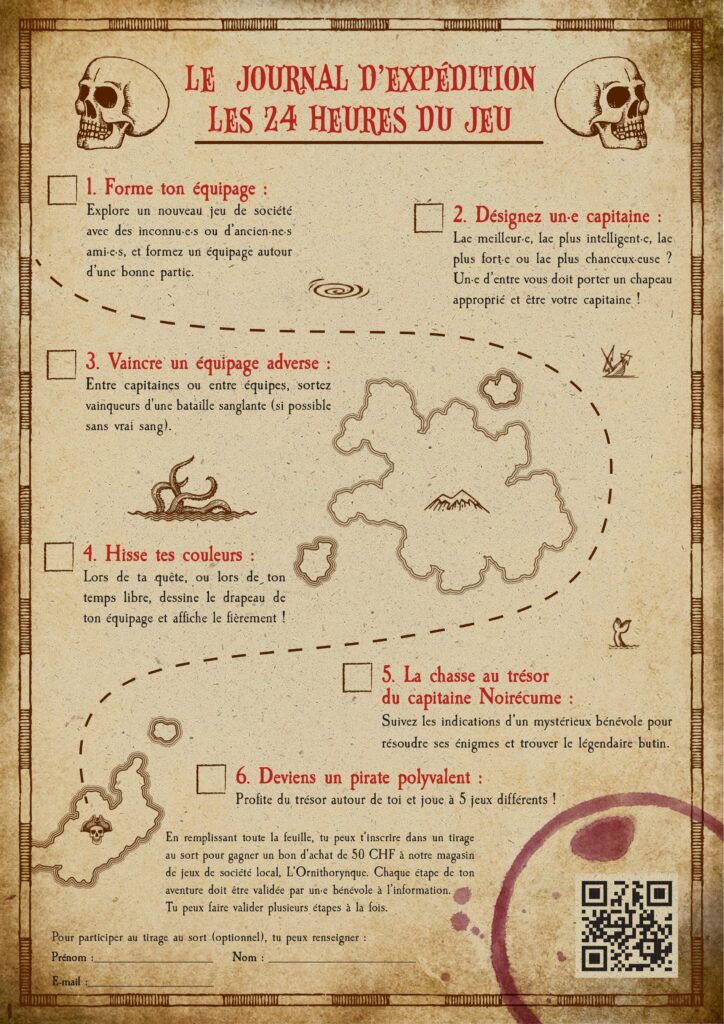 Réalisation d’un journal d’expédition pour l’association de jeux de société L’Abordajeux à Neuchâtel, dans le cadre de l’événement Les 24 heures du jeu, sur le thème de la piraterie.