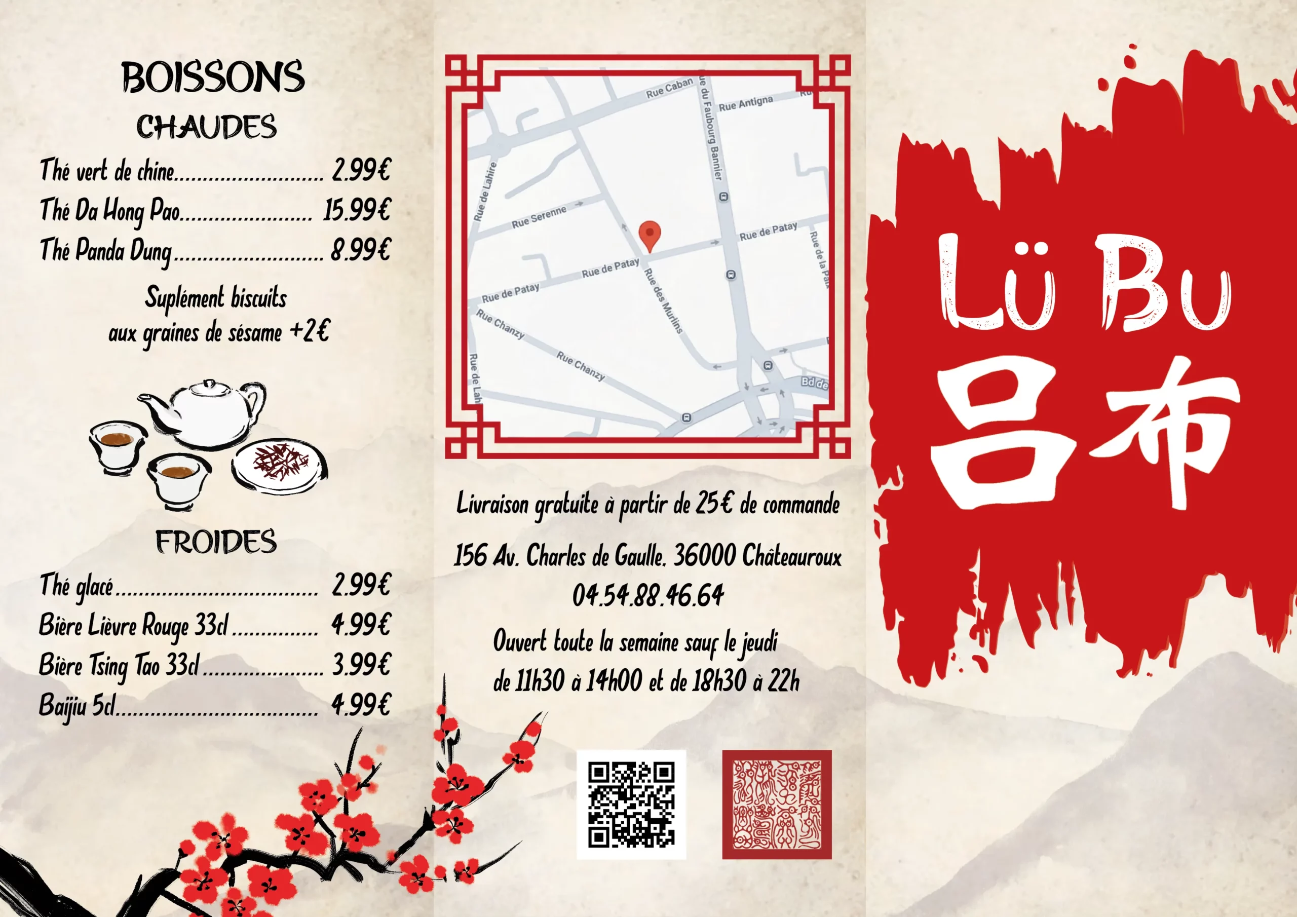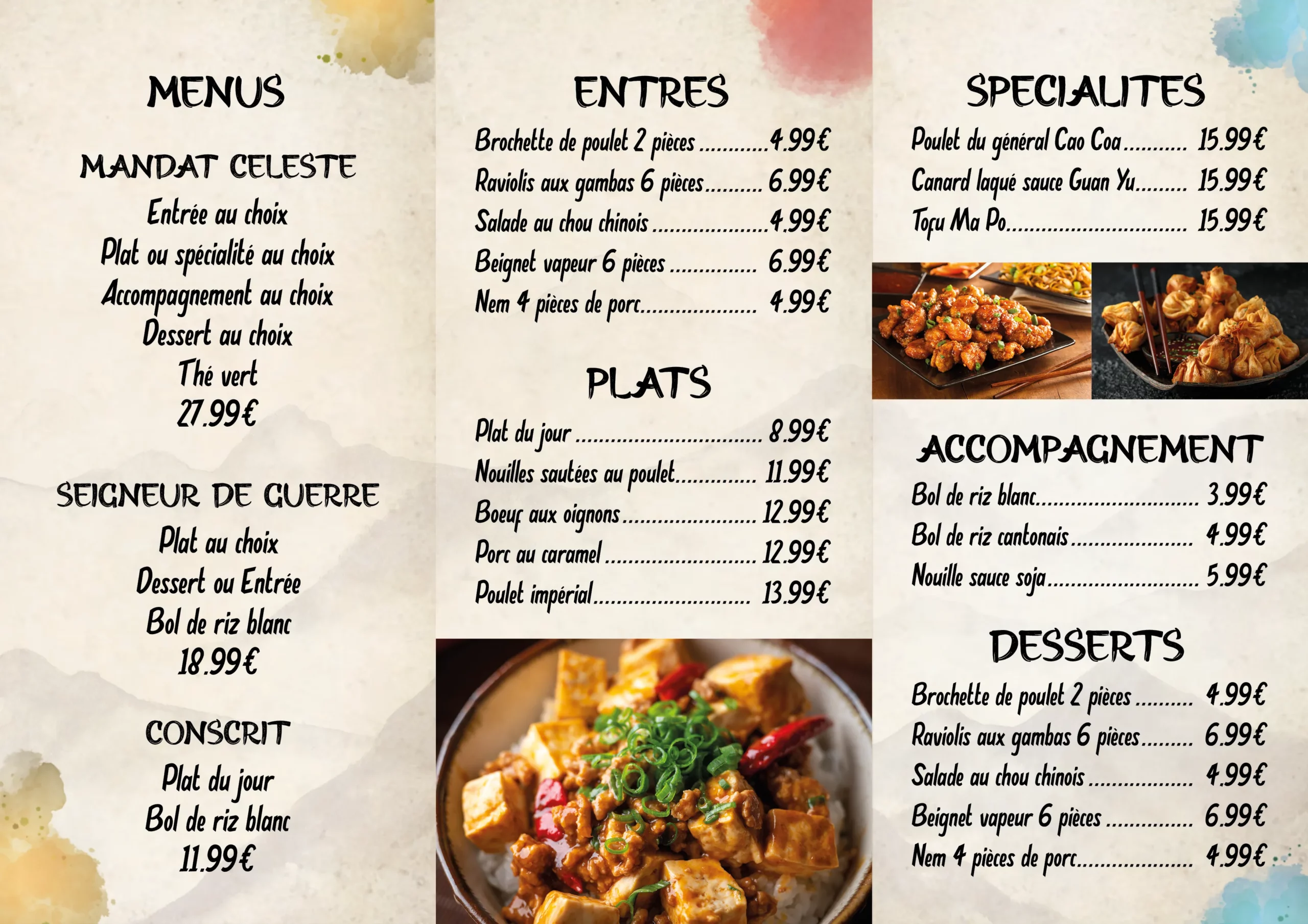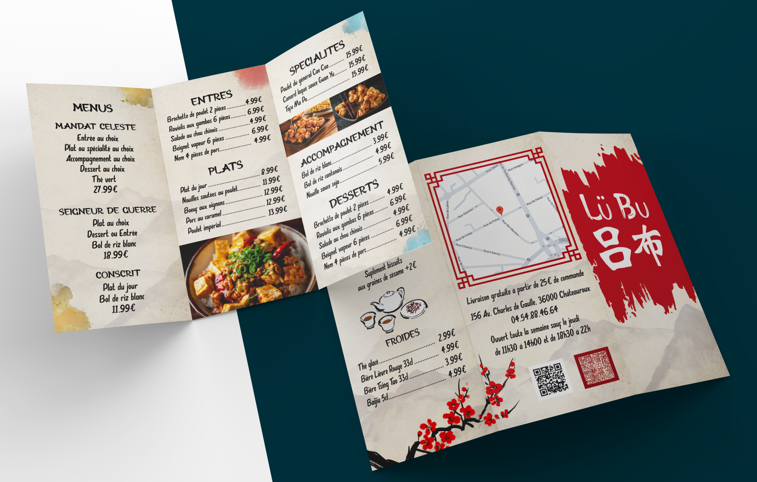 Création d’un menu dépliant pour un restaurant chinois, inspiré du roman la Guerre des Trois Royaumes.