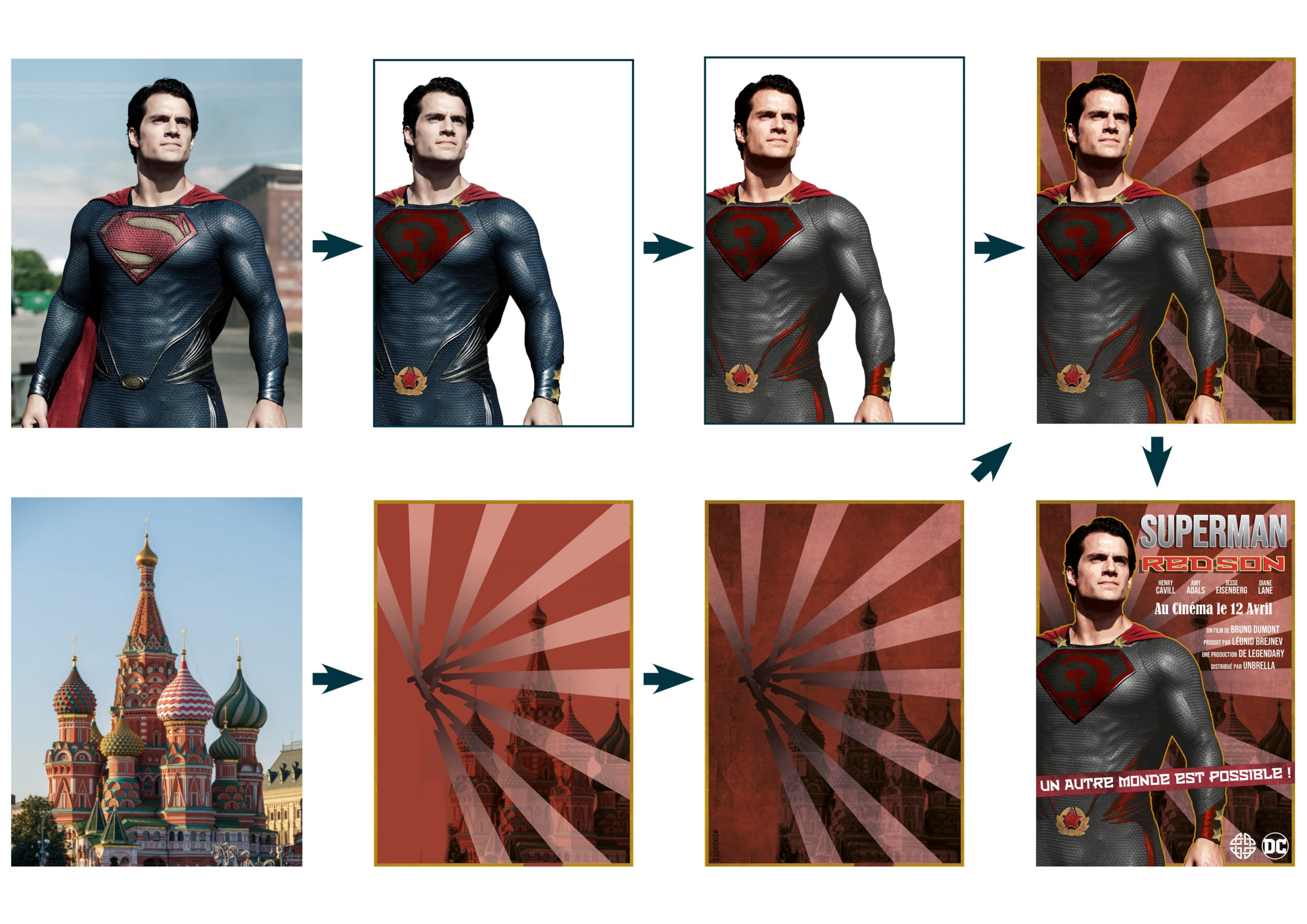 Création d’une affiche promotionnelle pour le film Superman: Red Son, réalisée à partir d’un photomontage du film Man of Steel et d’images Adobe Stock, pour créer une affiche d’inspiration propagande soviétique.